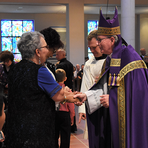 Godparent Louise Mazuchowski accompanies catechumen Linda Ramsaran to be welcomed by Bishop John Noo